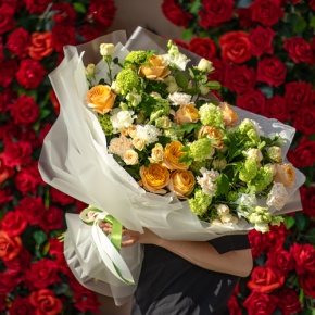 Букет "Персиковый десерт" из вибирнума, эустом, микса роз и диантусов