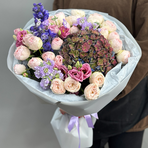 Букет "Бергамот" из Голландской гортензии, кустовых пионовидных роз Мэнсфилд парк, ароматных маттиол, дельфиниума и эустом