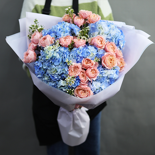 Букет "Тону в твоих глазах" из кустовых пионовидных роз Джульетта, хамелациума и гортензий
